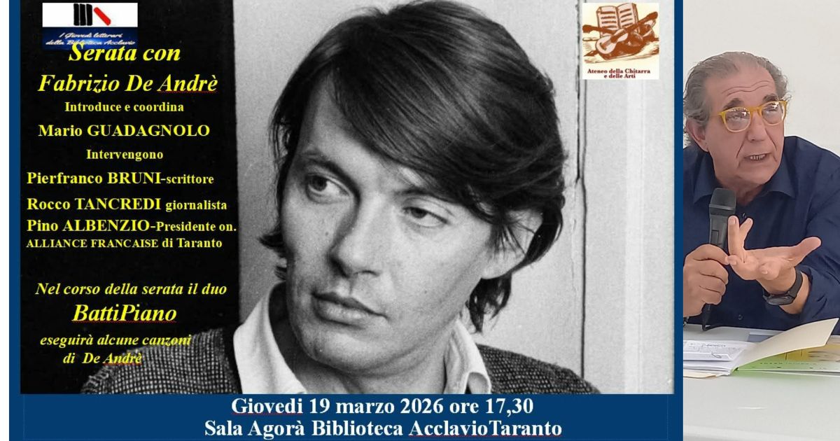 Taranto rende omaggio a Fabrizio De André con un incontro dedicato alla sua poetica e alla forza culturale delle sue canzoni. L’appuntamento è previsto il 19 marzo alle 17.30 nella sala Agorà della Biblioteca Acclavio, in piazzale...