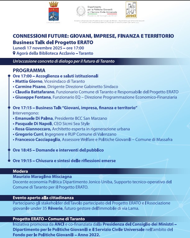 All’Agorà della Biblioteca Acclavio si terrà il Business Talk “Connessioni Future”, un evento promosso dal progetto ERATO del Comune di Taranto. L’iniziativa rappresenta un’importante occasione di dialogo tra giovani, istituzioni, finanza e impresa, con l’obiettivo di costruire percorsi di sviluppo sostenibile e partecipato per il futuro della città.