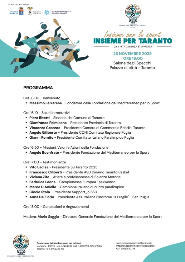 Insieme per lo sport è la parola chiave principale dell’iniziativa che il 26 novembre riunirà istituzioni, comunità e realtà sportive locali nel Salone degli Specchi di Palazzo di Città. L’evento rappresenta un momento di confronto sul lavoro svolto negli ultimi otto mesi dalla Fondazione del Mediterraneo per lo Sport e sulle prospettive in vista del 2026, anno centrale per lo sviluppo dell’attività sportiva cittadina.