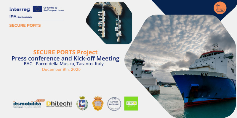 SECURE PORTS (Security Enhancement of Cyber and Physical Infrastructures in South Adriatic Small Ports) è un progetto di cooperazione transfrontaliera finanziato dal programma Interreg IPA South Adriatic 2021-2027. Dura 30 mesi e vede ITS Academy Mobilità come capofila. Partecipano inoltre DHITECH – Distretto Tecnologico HIGHTECH, il Comune di Gallipoli, il Comune di Montenero di Bisaccia, Papillon 1 dal Montenegro ed ENVIO NGO dall’Albania.