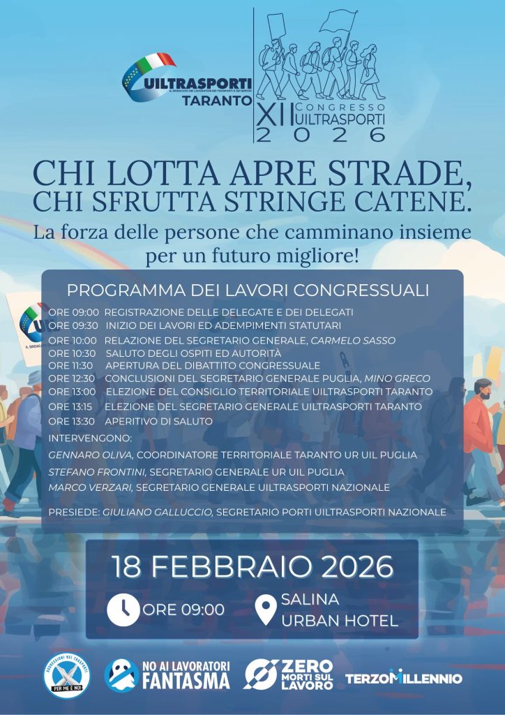 Il 18 febbraio si terrà l’XII Congresso UILTRASPORTI Taranto. L’appuntamento è al Salina Urban Hotel, a partire dalle 9. È un passaggio importante per il sindacato dei lavoratori dei trasporti e dei servizi. Inoltre sarà l’occasione per definire priorità e prospettive nel territorio ionico.