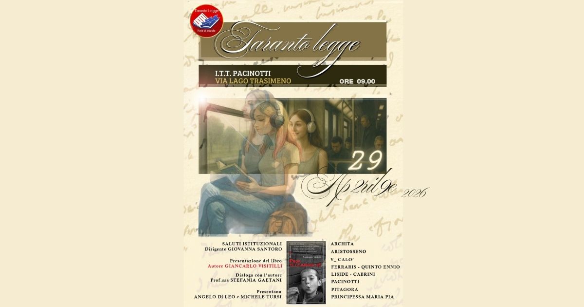 L’iniziativa riunirà ragazze e ragazzi dell’Archita, dell’Aristosseno, del Calò, del Liside-Cabrini, del Ferraris-Quinto Ennio, del Pacinotti, del Pitagora e della Principessa Maria Pia. Una partecipazione ampia, promossa nell’ambito della Rete scolastica tarantina, che conferma il lavoro condiviso tra gli istituti della città sui temi della cultura, della lettura e dell’espressione giovanile.