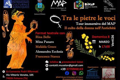 PULSANO – Il Museo Archeologico di Pulsano (MAP) dedica una giornata al culto della donna nell’antichità. L’appuntamento è per domenica 8 marzo 2026, dalle 17:00, nelle sale del museo. L’iniziativa un...