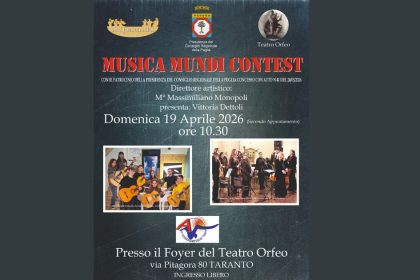 Ingresso libero per le esibizioni di orchestre scolastiche e accademiche nel foyer, protagonisti giovani musicisti del territorio Si conclude oggi a Taranto il “Musica Mundi Contest”, con il secondo e...